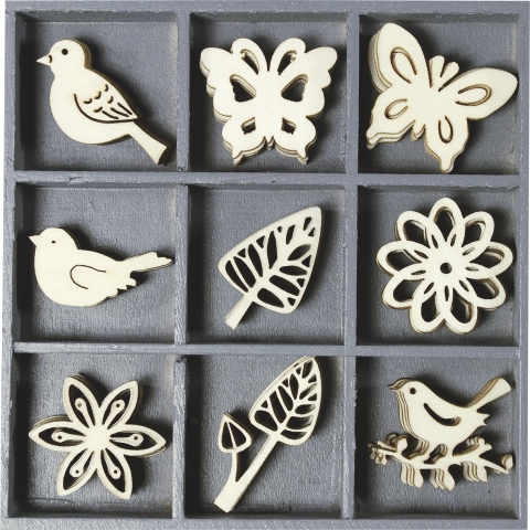 Die Motive zeigen Vögel, Schmetterling, Blätter...