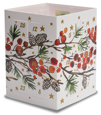 Kleiner Adventskalender, welcher als Doppelpostkarte versendet werden kann.