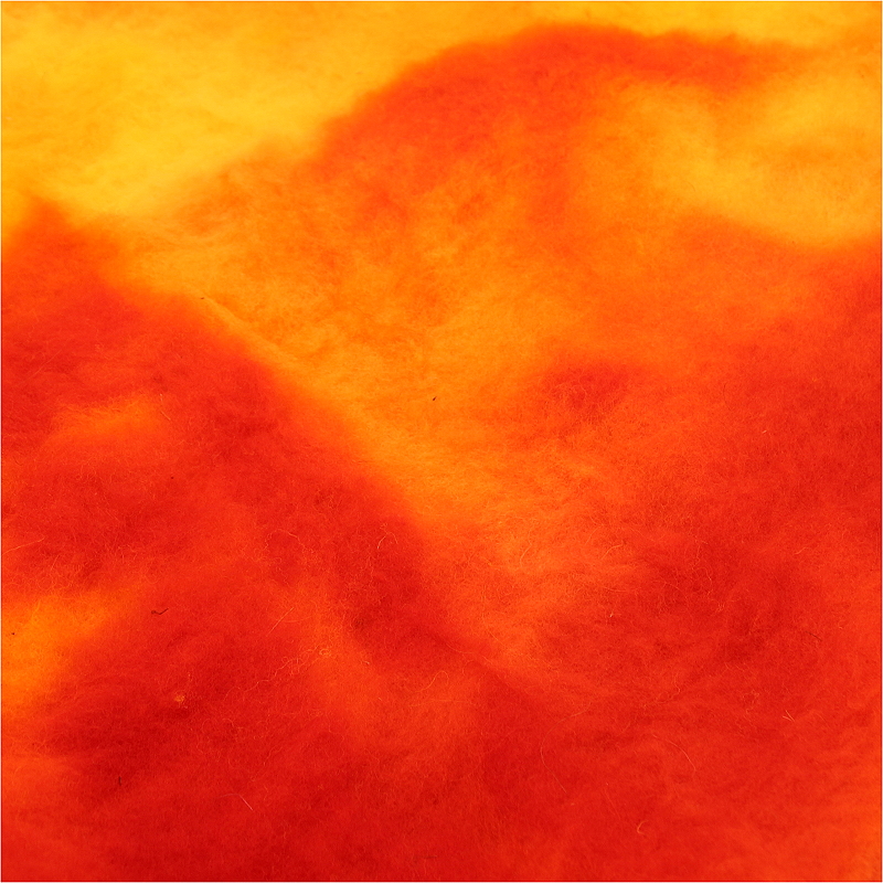 Die Wolle ist natürlich auch mit anderen Filzwollen kombinierbar, wenn z.B. ein Teppich entstehen soll. Wenn dunklere Farben als Untergrund gelegt werden, wirkt die Farbe intensiver, bei helleren Wollen wirkt es pastelliger, denn beim Walken dringen immer Fasern der unteren Wolle durch die obere hindurch.