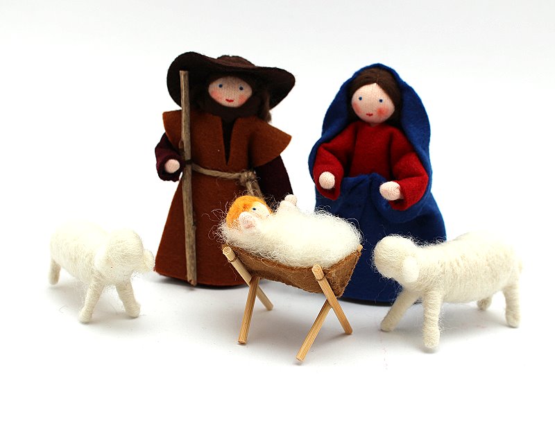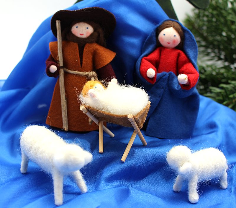 Die Puppen sind aus Filz und stehen auf einem Holzkegel, die Schafe sind aus Schafwolle.