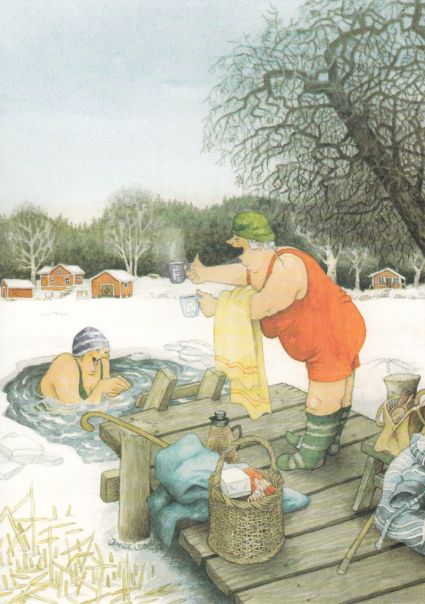 Postkarte Frauen baden im Eisloch