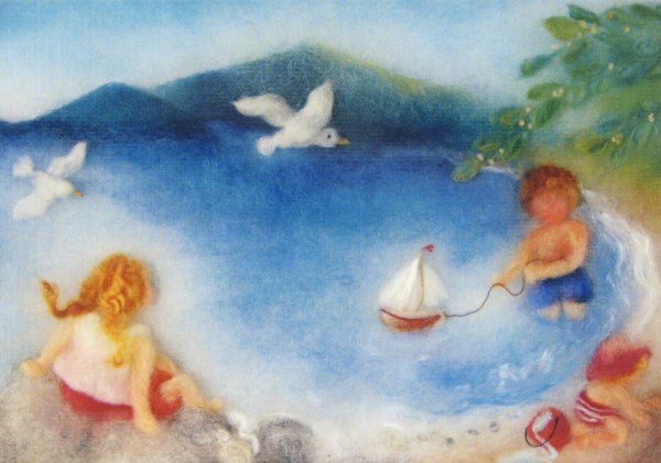 Postkarte Kinder am See - Wollbild