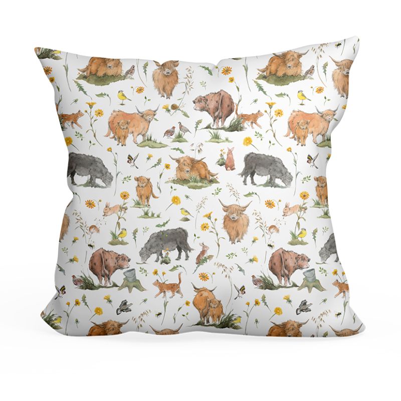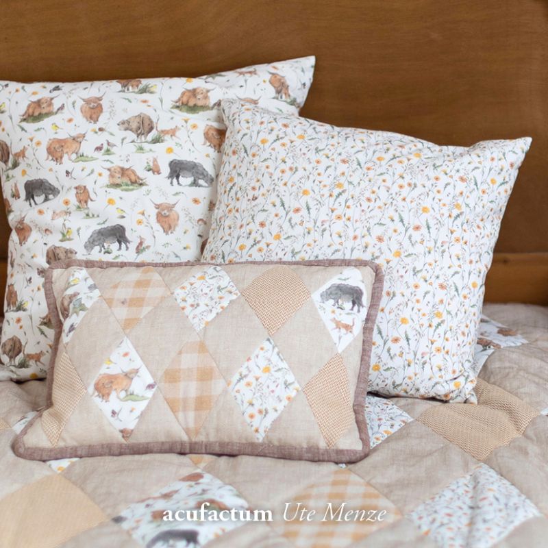 Pures Weideglück spiegelt sich auf diesem wunderschönen Stoff wieder. Die feinen Zeichnungen von Sophia Drescher zeigen diese wunderschönen Tiere von ihrer sanften, gutmütigen Art. Vögel, Wildhühner, Mäuschen, Katzen, Schnecken, Hummeln und Kaninchen teilen sich mit ihnen die saftige Sommerwiese mit Löwenzahen und Gras.
