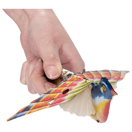 Ein Vogel aus Metall, der zwitschern und dabei mit den Flügeln schlagen kann -voll mechanisch.