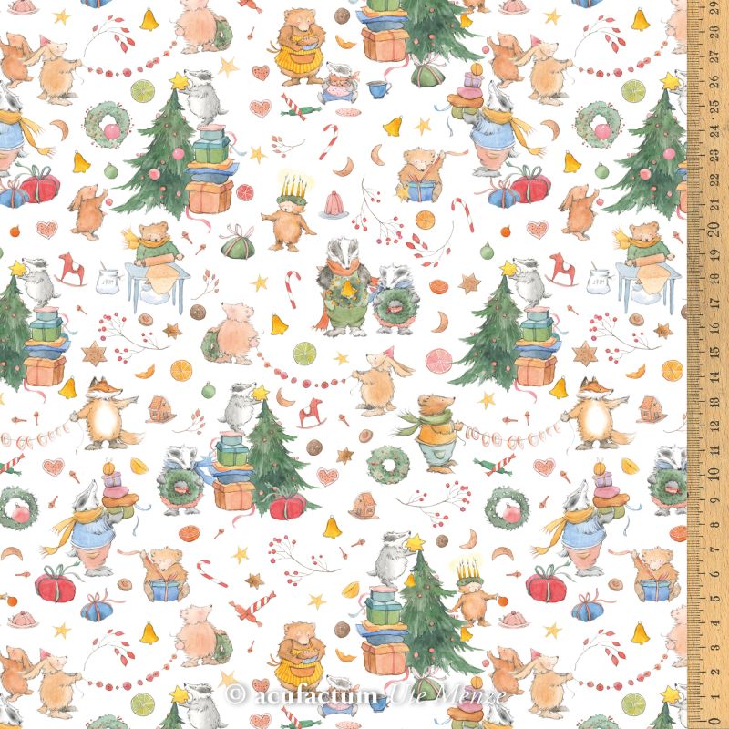 Auf diesem Stoff geben sich die Tierfamilien alle Mühe, um den Advent so
