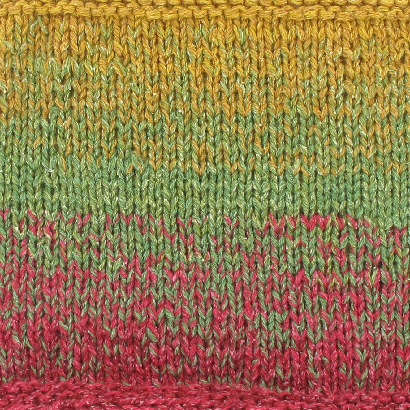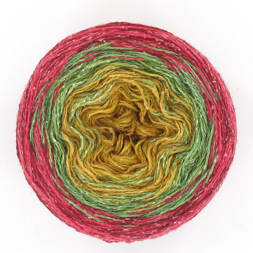 Das Farbverlaufsgarn ist gefacht, dies bedeutet, dass mehrere Fäden nebeneinander laufen und nicht verzwirnt sind.