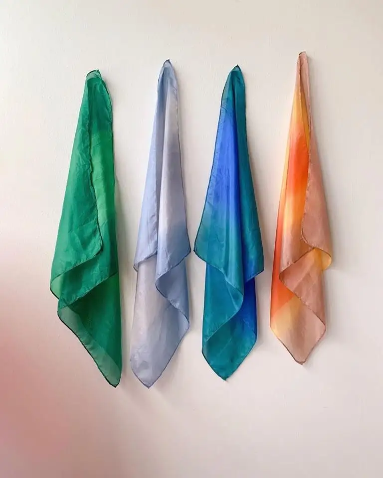 Kleine Seidentücher von Sarah' Silk, genau richtig für kleine Hände. Perfekt für kreatives Spiel: Aus Grün wird Gras, aus Blau das Wasser, Rosa wird ein Prinzeninnenumhang... Viele Eltern nutzen sie als Halstucher, zum Guckvergnügen, zum Einpacken kleiner Geschenke und zum einfachen Verkleiden.