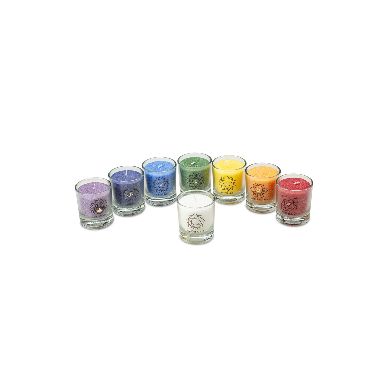 Jede Kerze entspricht einem speziellen Chakra und kann harmonisierend wirken. Auch bestens geeignet für Entspannung und Meditation.